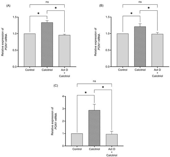 Inhibition of PON1 expression by actinomycin D (Act D) after 24 h (A), 48 h (B), and 72 h (C) of treatment. HepG2 cells were pretreated with 10 µg/mL Act D for 10 min followed by the addition of calcitriol. The PON1 mRNA levels were determined and normalized to the 18S mRNA levels. The results are expressed as the mean ± standard deviation (SD) of three independent experiments in duplicate. The p values were calculated using the Mann–Whitney U test (* p < 0.05). ns: not statistically significant.