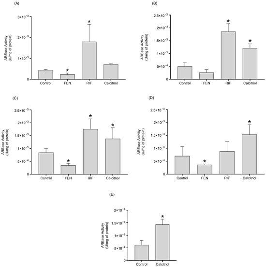 Effect of FEN, RIF, and calcitriol on the AREase activity of PON1 in HepG2 cells after 24 h (A), 48 h (B), 72 h (C), 96 h (D), and 120 h (E, only calcitriol) of treatment. HepG2 cells were treated with 0.05% DMSO (control), 250 µM FEN, 10 µM RIF, and 0.25 µM calcitriol. PON1 activity toward phenyl acetate was measured. The results are expressed as the mean ± standard deviation of three independent (SD) experiments by duplicate. The p values were calculated using the Mann–Whitney U test (* p < 0.05 vs. control).