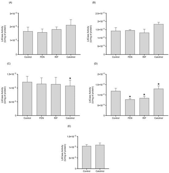 Effect of FEN, RIF, and calcitriol on the LACase activity of PON1 in HepG2 cells after 24 h (A), 48 h (B), 72 h (C), 96 h (D), and 120 h (E, only calcitriol) of treatment. HepG2 cells were treated with 0.05% DMSO (control), 250 µM FEN, 10 µM RIF, and 0.25 µM calcitriol. The PON1 activity towards dihydrocoumarin was measured. The results are expressed as the mean ± standard deviation of three independent experiments by duplicate. The p values were calculated using the Mann–Whitney’ U test (* p < 0.05 vs. control).