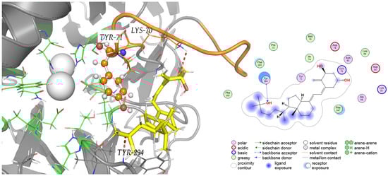 PON1–calcitriol complex with 2D interaction diagram. The green residues (sticks) indicate the binding site, the orange residue shows TYR71 (ball and sticks), yellow indicates the ligand, and red dashed lines denote the hydrogen bonds.