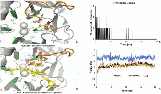 Three-dimensional representation of PON1 in (A) the absence of ligand and (C) in the presence of ligand. (B) Hydrogen bond interactions formed during MD simulation and (D) Root Mean Square Deviation (RMSD) plot of the systems and calcitriol during the 20 ns MD simulations. The green residues (sticks) indicate the binding site, the orange residue shows TYR71 (ball and sticks), yellow indicates the ligand.
