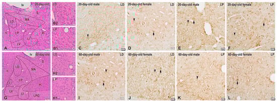 Representative images demonstrating dynorphin (DYN) expression in the bed nucleus of the stria terminalis (BNST) of preadolescent and postadolescent rats. (A) Low-power photomicrograph of a coronal H&E-stained section showing the structural organization of the BNST in 20-day-old rats and its composite subnuclei, i.e., medial anterior nucleus (MA), lateral dorsal nucleus (LD), lateral intermediate nucleus (LI), lateral posterior nucleus (LP), and lateral ventral nucleus (LV). Panels (B1,B2) show high-magnification images of the lateral posterior (LP) and lateral dorsal (LD) nuclei, respectively. Photomicrographs of adjacent sections illustrating DYN-immunoreactive neurons and fibers in the LD and LP nuclei of the BNST of 20-day-old male (C,E) and female (D,F) rats. Note the sparse DYN-immunoreactive neuronal perikarya (arrows) and varicose nerve fibers (arrowheads) scattered in both BNST nuclei. (G) Overview of BNST nuclei in 60-day-old rats, routinely stained with H&E and higher-magnification images of the LP (H1) and LD (H2) nuclei in insets. (I–L) High-power photomicrographs of the LP and LD in adult male (I,K) and female (J,L) rats showing the enhanced DYN expression in scattered neuronal somata (arrows) and varicosities (arrowheads). ac, anterior commissure; ic, internal capsule; J, juxtacapsular nucleus; LPO, lateral preoptic area; lv, lateral ventricle; S, septal area. Scale bars, 100 µm (A,G), 20 µm (B1,B2–F,I–L).