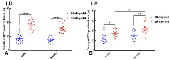 Age- and sex-dependent differences in DYN-immunoreactive fiber density in the lateral dorsal (LD) and lateral posterior (LP) subdivisions of the BNST. Scatter-dot plots illustrate quantitative analysis of the density of DYN-immunopositive fibers (expressed as the percentage of area occupied by immunoreactive fibers) in BNST subregions of 20-day-old (blue) and 60-day-old (red) male and female rats. Individual data points represent measurements from single animals, horizontal lines indicate group mean values, and vertical error bars represent the standard error of the mean (SEM). (A) In the BNSTLD, fiber density significantly increased from preadolescence (20 days) to postadolescence (60 days) in both sexes (**** p < 0.0001). (B) Similarly, the BNSTLP exhibited significant age-related increases in DYN fiber density, which were markedly pronounced in females (** p < 0.01) and statistically significant in males (* p < 0.05). These data reveal robust developmental upregulation and sex-specific differences in the DYNergic innervation patterns within distinct BNST subnuclei.