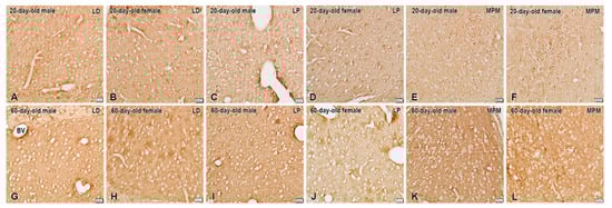 Immunohistochemistry revealed low-to-moderate expression levels of DYN in the BNSTLP and BNSTLD in both male and female rats of the two age groups (Figure 1). Specifically, only a few faintly stained DYN-containing neurons were observed in the BNSTLD of 20-day-old rats (Figure 1C,D), while a few intensely stained DYN-containing perikarya were scattered among the unstained neurons in this nucleus in 60-day-old males and females (Figure 1I,J). Likewise, isolated DYN-positive perikarya with a weak immunostaining were found in the BNSTLP of preadolescent animals (Figure 1E,F), while more neuronal cell bodies were seen intensely stained in the same nucleus of adult rats, predominantly in females (Figure 1K,L). Conversely, the immunohistochemical reaction for DYN was more pronounced in the nerve fibers in both BNSTLP and BNSTLD in the two sexes and age groups. In particular, numerous DYN-immunopositive varicose fibers and dot-like structures, presumably nerve terminals, were observed in both BNST subnuclei, although they were more abundant in the female adult rats (Figure 1J,L).