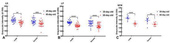 Quantitative analysis of KOR immunoreactivity in subnuclei of the BNST. Scatter dot plots illustrate grayscale intensity values (0–255), inversely proportional to the level of KOR immunoreactivity in the lateral dorsal (LD; panel (A)), lateral posterior (LP; panel (B)), and medial posteromedial (MPM; panel (C)) BNST subnuclei of 20-day-old (blue) and 60-day-old (red) male and female rats. Data are expressed as group means ± SEM with individual animal values indicated by dots. Lower grayscale intensity indicates higher KOR expression. Significant developmental increases in KOR immunoreactivity (decrease in grayscale intensity) were evident in the BNSTLD (males: ** p < 0.01; females: *** p < 0.001), BNSTLP (both sexes: **** p < 0.0001), and BNSTMPM subdivisions (males: **** p < 0.0001; females: ** p < 0.01), demonstrating pronounced age-dependent modulation across BNST subnuclei.
