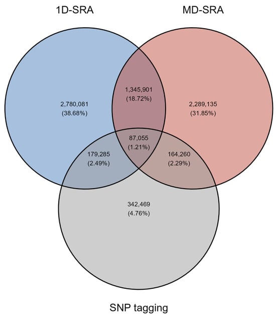 Both the 1D-SRA and MD-SRA approaches selected a very similar number of SNPs marking features relevant for classification. However, the overlap in SNPs between the two approaches was very low. Interestingly, the SNP tagging approach shared an equivalent overlap with 1D-SRA and MD-SRA (Figure 1).
