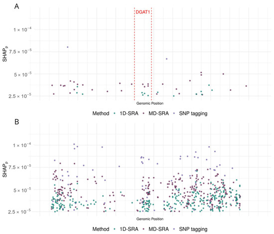 SHAP values corresponding to (A) the 100 kbp region (14:554,070–14:662,687) that harbours the DGAT1 gene and (B) the 100 kbp region (14:80,000,175–14:80,099,518) are located in a noncoding region on the distal part of the chromosome.