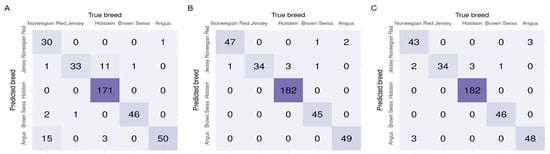 - For each of the reduced datasets, K multinomial logistic regression models were fitted for B = 5 breed classification (Equation (1)):where represents the estimated breed classification probability encoded as an incidence matrix, is a vector of breed-specific intercepts, is a matrix of breed-specific SNP estimates with the corresponding design matrix containing SNP genotypes coded as follows: 0/0 represented as 0, 0/1 represented as 1, and 1/1 represented as 2.