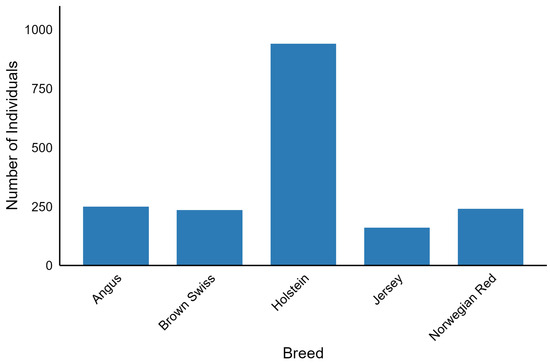 The 1000 Bull Genomes Project Run 9 consists of 5063 whole-genome sequences of Bos taurus bulls with 33,595,340 biallelic SNP genotypes called by GATK software [21] and imputed and phased by Beagle 4.0 [22]. Coverage across these sequences ranged from 1.97x to 173.10x. The dataset included 140 breeds. The subset of this dataset analysed in our study (Figure 4) consisted of individuals with international IDs, characterised by a genome-averaged coverage of at least 8, and belonging to breeds represented by at least 150 individuals. SNP preprocessing was carried out with bcftools 1.10.2 [23] in parallel mode using 25 threads and involved removing polymorphisms with a call rate less than 95%, a minor allele frequency below 5%, and multiallelic SNPs. After filtering, 1825 individuals from five breeds (Angus, Brown Swiss, Holstein, Jersey, and Norwegian Red) were included in the downstream analysis, resulting in 11,915,233 SNPs per individual. This dataset was divided into a training dataset of 1460 individuals and a test dataset of 365 individuals. Splitting was performed to obtain a balanced set of breeds between the training and test datasets.