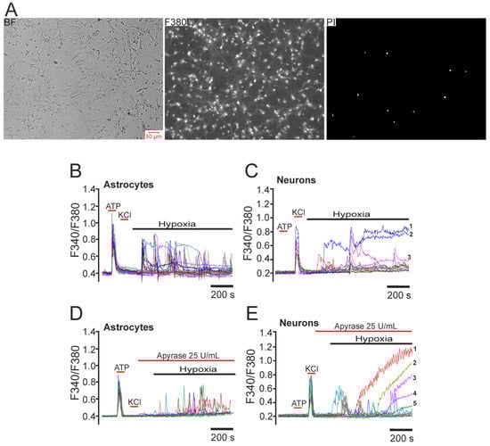 The effect of prolonged hypoxia (~30 min) on astrocytes and neurons of the hippocampus in primary cell culture: (A) images of rat hippocampal cell culture on the 10th day in vitro (DIV) in transmitted light (BF), fluorescence of the calcium-sensitive probe Fura-2 in the 380 nm registration channel (F380), and fluorescence of nuclei stained with propidium iodide (PI) after hypoxia; (B,C) Ca2+ signals of hippocampal astrocytes (B) and neurons (C) under hypoxic conditions; (D,E) Ca2+ signals of hippocampal astrocytes (D) and neurons (E) under hypoxic conditions after application of the ATP-cleaving enzyme apyrase (25 U/mL). ATP and KCl—application of 10 μM ATP and 35 mM KCl to identify astrocytes (characterized by Ca2+ signals in response to ATP) and neurons (characterized by Ca2+ signals in response to KCl). Labels 1–5: neurons with a global [Ca2+]i increase. For each panel, the experiments were performed in seven replicates.