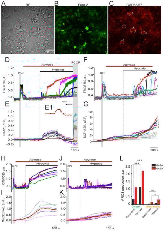 Differential effects of prolonged hypoxia on Ca2+ signaling and ROS production in hippocampal GAD 65/67(-) and GAD 65/67(+) neurons. (A–C) Transmitted microscopy images (A) of hippocampal cell culture corresponding to Fura-2 images (380 nm channel) (B) and immunocytochemical staining with antibodies against glutamate decarboxylase GAD65/67 (C). The white circles and numbers in panel (C) indicate GAD 65/67(+) neurons. (D,E) [Ca2+]i dynamics (D) and mitochondrial membrane potential (E) in GAD 65/67(-) and GAD 65/67(+) (numbers 1–5) neurons during hypoxia. (E1) Averaged values of mitochondrial membrane potential of GAD 65/67(-) (black curve) and GAD 65/67(-) (red curve) neurons during hypoxia and in response to the application of 1 μM of a mitochondrial respiratory chain uncoupler—FCCP (to detect mitochondria functionality). (F,G) Simultaneous [Ca2+]i dynamics registration (F) and ROS production (G) in the cytosol of GAD 65/67(-) and GAD 65/67(+) (numbers 1–5) neurons during hypoxia. Numbers indicate signals of GAD 65/67(+) neurons and correspond to the images in panels (C,H,I). Simultaneous [Ca2+]i dynamics (H) and ROS production (I) by mitochondria of GAD 65/67(+) neurons during hypoxia. (J,K) Simultaneous [Ca2+]i dynamics registration (J) and ROS production (K) by mitochondria of GAD 65/67(-) neurons during hypoxia. (L) Rate of ROS production in the cytosol and mitochondria of GAD 65/67(-) (black bars) and GAD 65/67(+) (red bars) neurons during hypoxia. Averaged data for 63 (GAD 65/67(+) neurons) and 620 (GAD 65/67(-) neurons) cells are presented. Hypoxia was induced in the presence of the ATP-degrading enzyme apyrase (25 U/mL) to exclude the contribution of ATP secretion by astrocytes. KCl—short-term depolarization using a 35 mM KCl application to detect neurons. Statistical analyses were performed with the Student’s t-test. Differences are significant at *** p < 0.001 and * p < 0.05; n/s—differences are not significant (p > 0.05). For each panel, experiments were performed in 5 replicates.