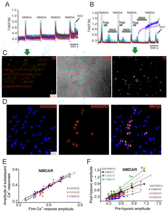 Hypoxia exhibits both detrimental and protective effects. Short-term hypoxia episodes protect neurons from subsequent ischemic damage by activating preconditioning mechanisms that reduce [Ca2+]i overload [,]. Using Fura-2-loaded hippocampal neurons, we recorded [Ca2+]i changes during NMDA receptor (NMDAR) activation before and after hypoxia–reoxygenation (H/R) episodes. Brief NMDA application (10 μM, Mg2+-free medium) evoked consistent [Ca2+]i responses (Figure 3A,B). After three H/R cycles (3 min hypoxia/10 min reoxygenation), response amplitudes progressively decreased, from 0.35 to 0.06 (Figure 3B, red curve), while reoxygenation triggered synchronous [Ca2+]i transients (Figure 3B), reflecting network hyperexcitability. Two neurons showed global [Ca2+]i increases during the third reoxygenation, indicating damage. H/R increased neuronal death (18–20% vs. <1% in the controls; Figure 3C). Immunostaining revealed that global [Ca2+]i increases occurred exclusively in GAD65/67(+) neurons (Figure 3D). While most neurons showed reduced NMDAR responses post-H/R (slope decrease: 0.89 ± 0.02 to 0.49 ± 0.03; Figure 3F), surviving GAD65/67(+) neurons exhibited enhanced responses (slope increase: 0.99 ± 0.11 to 1.48 ± 0.13; Figure 3F). This dichotomy suggests GABAergic-neuron-specific plasticity during H/R.