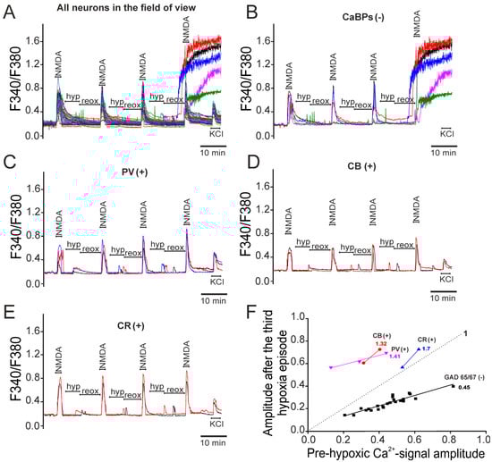 To investigate the role of Ca2+-binding proteins in the functioning of GAD65/67(+) neurons during hypoxia (Figure 4A), after the Ca2+-signals’ registration, the cells were stained with antibodies against GAD65/67. The Ca2+ signals of hippocampal GAD65/67(+) neurons that did not contain the studied calcium-binding proteins are plotted separately in Figure 4B, where it can be seen that all neurons recorded a global [Ca2+]i increase during reoxygenation, whereas the GAD65/67(+) neurons that expressed parvalbumin (Figure 4C), calbindin (Figure 4D), or calretinin (Figure 4E) survived the hypoxia/reoxygenation episode model. An analysis of the amplitudes of the Ca2+ signals during NMDAR activation after three episodes of hypoxia/reoxygenation showed that in glutamatergic neurons (GAD65/67(−)) there was a decrease in the amplitudes of the Ca2+ signals and the slope of the linear approximation of the amplitudes was 0.45 (Figure 4F—GAD65/67(−)), which indicates a clearly expressed phenomenon of hypoxic preconditioning. The slope of the linear functions approximating the amplitudes of the Ca2+ signals of GAD65/67(+) neurons expressing parvalbumin, calbindin, or calretinin were 1.41, 1.32, and 1.7, respectively (Figure 4F). That is, in GAD65/67(+) neurons expressing calcium-binding proteins, the phenomenon of hypoxic preconditioning was not activated, but, on the contrary, the episodes of hypoxia/reoxygenation caused toxic effects that contributed to an increase in the amplitudes of the Ca2+ signals during NMDAR activation.
