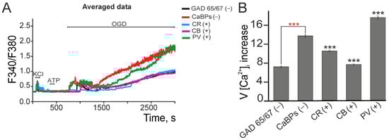 Previous studies have demonstrated that 40 min of oxygen–glucose deprivation (OGD) induces death in 80 ± 18% of cells []. Our analysis of calcium dynamics reveals that neurons typically exhibit biphasic [Ca2+]i elevations during OGD—an initial reversible phase followed by irreversible accumulation (Figure 5A), though with population-specific variations in steady-state levels. Immunohistochemical characterization showed that GAD 65/67 (-)- neurons displayed initial [Ca2+]i transients with subsequent recovery before a delayed global elevation (7.7 a.u.) (Figure 5B), while CaBP-negative GAD 65/67(+)- neurons showed immediate sustained elevations (14.5 a.u.) without a recovery phase (Figure 5A,B). Parvalbumin-expressing GAD65/67(+) neurons maintained both phases but with elevated [Ca2+]i accumulation rates compared to their CaBP-negative counterparts. In contrast, calbindin- or calretinin-positive Gad 65/67 (+) neurons exhibited attenuated global [Ca2+]i increases, with CR+ neurons additionally suppressing reversible phase transients. Calcium imaging revealed that GABAergic neurons (GAD65/67(+)) exhibited a robust increase in [Ca2+]i upon OGD (Figure 5A), which, in previous experiments (Figure 1), correlated with the loss of viability. In contrast, neurons expressing calcium-binding proteins (CB or CR) exhibited significantly smaller changes in the Ca2+ responses (Figure 5B), which may indicate their increased resistance to ischemic conditions. Notably, CB/CR expression was associated with lower OGD-induced [Ca2+]i accumulation in GAD65/67(+) neurons, reaching levels similar to those in GAD65/67-negative populations (Figure 5A,B). This correlation suggests a potential link between calcium-binding proteins and hypoxic susceptibility, possibly involving differential regulation of calcium homeostasis.