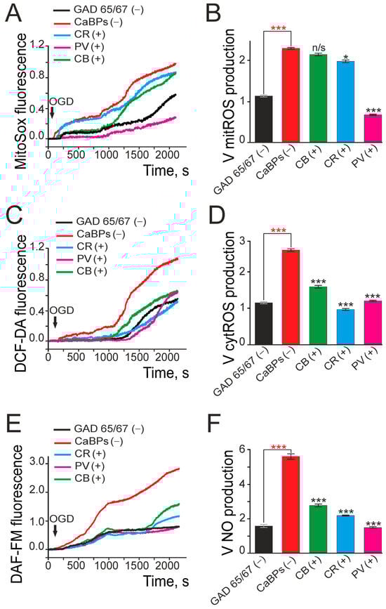 Mitochondrial ROS production (A), cytosolic enzyme-derived ROS (C), and nitric oxide formation (E) in GAD65/67(+) or GAD65/67(−) neurons under OGD conditions, analyzed by calcium-binding protein expression. Panels (A,C,E) show the averaged curves (10 cells per curve) of mitochondrial ROS production (A), cytosolic ROS (C), and nitric oxide production (E) in GAD65/67(−) or GAD65/67(+) neurons. Panels (B,D,F) display the rates of mitochondrial ROS production (B), cytosolic ROS (D), and nitric oxide production (F). Statistical analyses were performed using the Student’s t-test. Significant differences are indicated at * p < 0.05 and *** p < 0.001; n/s—not significant (p > 0.05). Black asterisks denote comparisons between the experimental groups expressing CaBPs and the CaBPs(−) control group. Red asterisks indicate comparisons between GAD65/67(−) neurons and the CaBPs(−) group. The experiments were performed in quadruplicate for each panel.