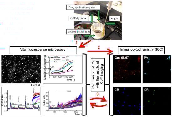 Scheme of the original setup for creating hypoxia/reoxygenation episodes or OGD in vitro and a method for comparing the results of neuroimaging with data from the immunocytochemical staining of cell cultures. Hippocampal neurons were grown on round coverslips and loaded with fluorescent probes. They were mounted in an experimental chamber, and a grid was applied to the bottom of the glass with a waterproof marker. The chamber with cells was mounted on the stage of a fluorescence microscope, equipment for working with hypoxia was brought in, and an experiment was conducted to record the vital physiology of neurons. Then, the cells were fixed and loaded with antibodies. The chamber with cells was transferred to a confocal microscope, the area of interest was found using a grid, in which the intravital parameters of cells under hypoxic conditions were previously recorded, and fluorescence imaging of secondary antibodies was performed. The confocal images were then compared with lifetime neuroimaging data to identify signal patterns characteristic of certain subtypes of GABAergic (GAD65/67(+)) neurons. Red numbers 1–3 indicate the following sequence of manipulations: 1—registration of Ca2+ dynamics, ROS production, or mitochondrial potential during hypoxia or OGD; 2—fixation of cells and staining with antibodies against GAD65/67, parvalbumin, calbindin, and calretinin, with secondary antibody fluorescence registration performed using a confocal microscope; and 3—comparison of cell images obtained in stage 1 and stage 2 and the identification of vital fluorescent signals characteristic of a certain type of neuron.