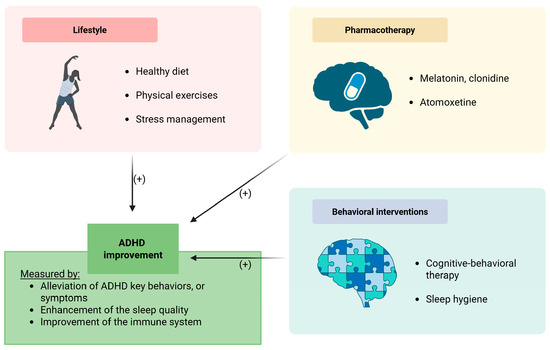 Proper treatment alleviates ADHD symptoms and most sleep disturbances, which, in effect, can improve immune health. There is a wide choice of suggested recommendations, depending on the patient’s characteristics. The most prevalent ADHD treatment includes behavioral interventions (cognitive–behavioral therapy (CBT), pharmacological treatments (sleep aids, melatonin, modifications of ADHD medication regimens), sleep hygiene practices, and lifestyle modifications (diet, exercise, stress management).