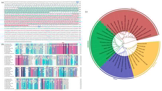 The nucleotide sequence of the CfER gene was successfully cloned and submitted to NCBI (OR365079), revealing a core sequence of 2138 bp, consisting of an 843 bp 3′ non-coding region and a 1404 bp open reading frame (ORF). The ORF encoded 432 amino acids. The computational analysis using ProtParam (http://web.expasy.org/protparam/) (accessed on 10 March 2024) online website indicates that the theoretical molecular weight of CfER is 4.85 kDa, with an isoelectric point of 7.58. Additionally, the aliphatic amino acid index is 78.36 and the average hydropathicity coefficient is −0.435. The nucleic acid sequence and predicted amino acid sequence of CfER are illustrated in Figure 1a.