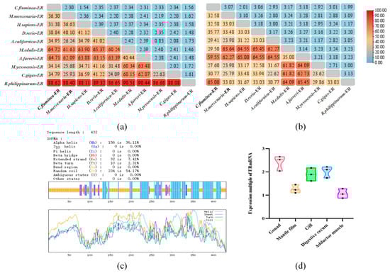 The genetic distance from genes of other species, secondary structure, and tissue-specific expression of CfER sequences. (a) Genetic distance of the full-length CfER sequence from genes of other species. (b) Genetic distance of the CfER-LBD sequence from genes of other species. Color intensity (redder hues) indicates higher similarity. (c) Secondary structure prediction of the CfER gene sequence. (d) Expression of ER in various tissues of C. fluminea.