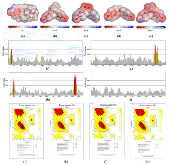 Electrostatic potential (ESP) maps of E2 and BPA and its substitutes, and evaluation results of ERRAT and PROCHECK models for homology models of LBD by D. rerio, C. fluminea, A. farreri, and R. philippinarum ERs. (a–e) represent the ESP diagrams of E2, BPA, BPS, BPF, and BPAF in sequence. The ESP value is represented on a color gradient bar, with red representing negative charge, blue representing positive charge, and white representing neutral charge. (f–i) are ERRAT evaluation graphs of ERsLBD three-dimensional structures of D. rerio, C. fluminea, A. farreri, and R. philippinarum, in turn. (j–m) are the Lagrange conformation maps of D. rerio, C. fluminea, A. farreri, and R. philippinarum ERs LBD, respectively, which are divided into four regions, namely, the red core region (the most favorable region), the yellow generally reasonable region (additional allowable region), and the red core region. Light yellow acceptable zone (generous allowed zone) and white unreasonable zone (not allowed zone).
