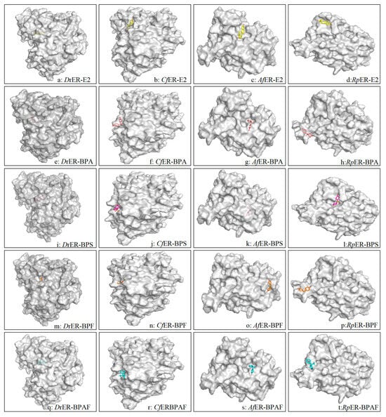 D. rerio, C. fluminea, A. farreri, and R.philippinarum are surface structure model diagrams formed by the connection with E2, BPA, BPS, BPF, and BPAF, respectively. Species–pollutant combinations labeled in the lower right corner. Gray regions depict protein structures of different substances, with central 3D stick models representing pollutants: E2 (yellow), BPA (light pink), BPS (purple), BPF (orange), and BPAF (blue).
