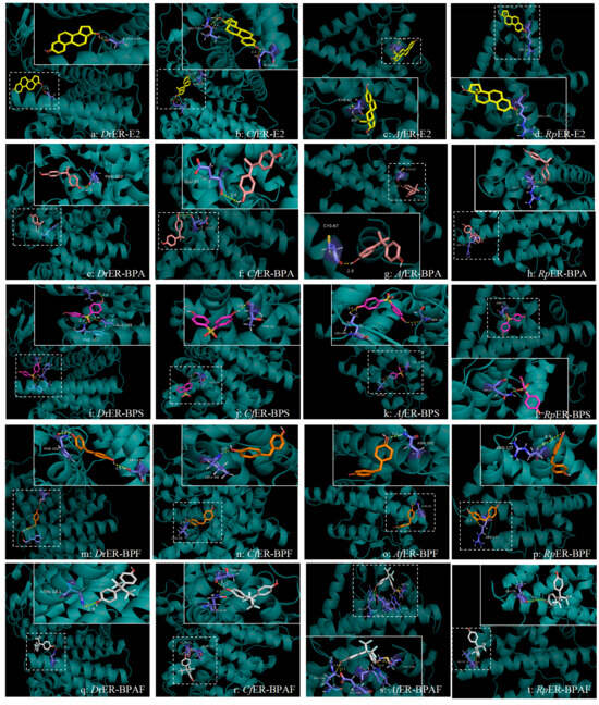 Prediction analysis diagram of interaction between amino acid residues and various pollutants of D. rerio, C. fluminea, A. farreri, and R. philippinarum. Row: species–pollutant interaction results; column: same pollutant across different species. Each figure consists of a whole picture and a partial picture. The white dashed box encircles the binding sites of the pollutants on the macromolecular proteins, and a local diagram with a white solid box is presented beside it to show the specific binding situation. The species–pollutant label is located at the lower right corner. Macromolecular protein 3D structures in cyan; pollutants as stick models (E2: yellow, BPA: pink, BPS: purple, BPF: orange, and BPAF: grey).