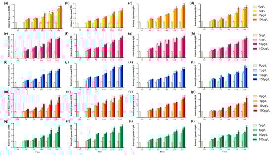As shown in Figure 6, under the stress exposure of BPA and its substitutes, it can be observed that the expression levels of ER mRNA in all four species showed a significant increase in the later stage of the experiment (p < 0.05). Among them, under the exposure of E2 and BPA, it could be observed that the expression level of the ER mRNA of A. farreri increased extremely significantly in the later stage of the experiment (p < 0.001) and it was more sensitive to BPA compared with the other three species. Under BPS exposure, as shown in Figure 6i–l, it can be observed that the ER mRNA expression levels of A. farreri and C. fluminea increased significantly compared to other species, and all three concentrations showed extremely significant increases in the later stage of the experiment (p < 0.001). In the later stage of the experiment, although R. philippinarum also showed a significant increase (p < 0.05), it was less sensitive to BPS compared with the other three species. Under BPF exposure, C. fluminea showed greater sensitivity. At 28 days, at concentrations of 10 μg/L and 100 μg/L, it exhibited extremely significantly increased phenomena (p < 0.001). Under BPAF exposure, the expression levels of ER mRNA in A. farreri and C. fluminea increased relatively more significantly, and both showed higher affinity for BPS, BPF, and BPAF.