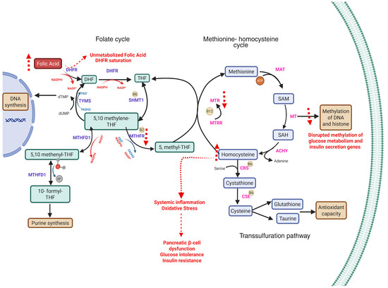 Disruptions in one-carbon metabolism due to folate and vitamin B12 imbalance and their implications for gestational diabetes mellitus (GDM). The diagram outlines the folate cycle, methionine–homocysteine cycle, and transsulfuration pathway, highlighting the key enzymes and metabolites. Excess folic acid (FA) intake can lead to accumulation of unmetabolized folic acid (UMFA) and dihydrofolate (DHF), resulting in DHFR (dihydrofolate reductase) saturation and impaired formation of tetrahydrofolate (THF). This limits the availability of 5-methyltetrahydrofolate (5-methyl-THF), a methyl donor required by methionine synthase (MTR) for the remethylation of homocysteine (Hcy) to methionine in a vitamin B12-dependent reaction [22]. Elevated homocysteine may promote oxidative stress, systemic inflammation, pancreatic β-cell dysfunction, glucose intolerance, and insulin resistance [23,24]. While not depicted, hormonal changes during pregnancy (progesterone, leptin, adiponectin) may also contribute to insulin resistance. Red dashed arrows indicate disruptions specifically attributed to excessive folic acid exposure. Abbreviations: FA, folic acid; DHF, dihydrofolate; THF, tetrahydrofolate; SHMT1, serine hydroxymethyltransferase 1; 5,10-methylene-THF, 5,10-methylenetetrahydrofolate; 5,10-methenyl-THF, 5,10-methenyltetrahydrofolate; 10-formyl-THF, 10-formyltetrahydrofolate; MTHFD1, methylenetetrahydrofolate dehydrogenase 1; MTHFR, methylenetetrahydrofolate reductase; 5-methyl-THF, 5-methyltetrahydrofolate; MTRR, methionine synthase reductase; SAM, S-adenosylmethionine; SAH, S-adenosylhomocysteine; CBS, cystathionine β-synthase; CSE, cystathionine γ-lyase; MAT, methionine adenosyltransferase; MT, methyltransferase; TYMS, thymidylate synthase; NADPH, nicotinamide adenine dinucleotide phosphate (reduced form).
