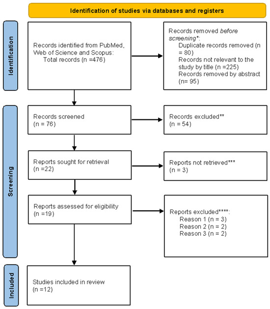 As shown in Figure 2, a total of 476 records were identified through database searching (PubMed, Web of Science, and Scopus). After the removal of 80 duplicate records and exclusion of 225 titles and 95 abstracts that were not relevant to the research question, 76 records remained for screening. Following the title and abstract review, 54 articles were excluded. Of the 22 reports selected for full-text retrieval, 3 could not be obtained. Nineteen full-text articles were assessed for eligibility, of which five were excluded for predefined reasons (n = 3: animal studies; n = 2: inappropriate setting, 2 = research question not relevant). Ultimately, 12 studies met the inclusion criteria and were incorporated into the final synthesis. All stages of screening and selection were performed manually without automation tools.