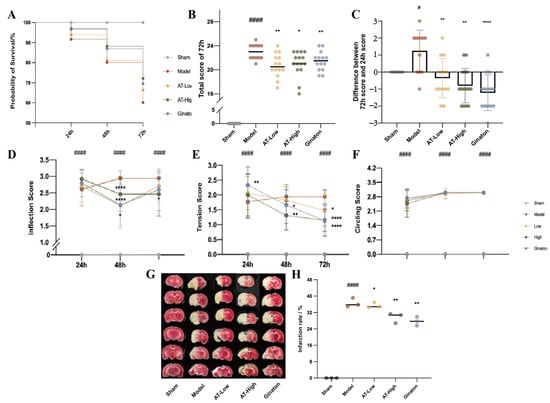 At the endpoint of the experiment (72 h after MCAO surgery), rats in the model group showed significant neurological injury. The total behavioral scores at 72 h after MCAO surgery and the difference between 72 h and 24 h of the rats in the model group were higher than those of the sham group (Figure 1B,C). Conversely, the total behavioral scores at 72 h after MCAO surgery and the difference between 72 h and 24 h of the rats in AT-Low, AT-High, and Ginaton groups were significantly decreased compared with the model group, suggesting that combined AS and TMP could alleviate nerve injury after MCAO surgery in rats. Compared with the sham group, the scores of the model group significantly increased at 24 h, 48 h, and 72 h. The neurological behavior scores of inflections and tension of each dose group were improved to some extent after administration (Figure 1D,E).