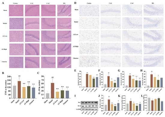 Combined AS and TMP improved MCAO-induced pathological structure injury, inflammation, and apoptosis of brain tissue in rats. (A) The H&E results were observed by a microscope (400×). (B) The level of TNF-α in the cortex. (C) The level of IL-10 in cortex. (D) TUNEL staining. (E) Apoptosis rate of cells in the cortex of each group. (F) Apoptosis rate of cells in the CA1 area of each group. (G) Apoptosis rate of cells in the CA3 area of each group. (H) Apoptosis rate of cells in the DG area of each group. (I) The Western blot bands. (J) Integrated density of Bax/Bcl-2. (K) Integrated density of Bax. (L) Integrated density of Bcl-2. GAPDH was used as a control. # p < 0.05 compared with sham group; ## p <0.01 compared with sham group; * p < 0.05 compared with model group; ** p < 0.01 compared with model group.