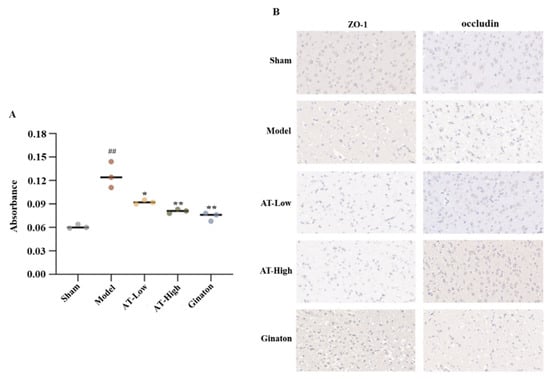 Immunohistochemistry was used to observe the distribution of ZO-1 and occludin and measure their protein expression levels. The brown positive areas of ZO-1 and occludin were predominantly distributed around the blue nucleus in the rats of the sham group, while the cell gap increased and the positive areas decreased in the model group. In AT-Low and AT-High groups, the cell gap decreased and the positive area increased, suggesting that combined AS and TMP could improve the MCAO-induced destruction of the tight junction structure in brain tissue (Figure 3B).