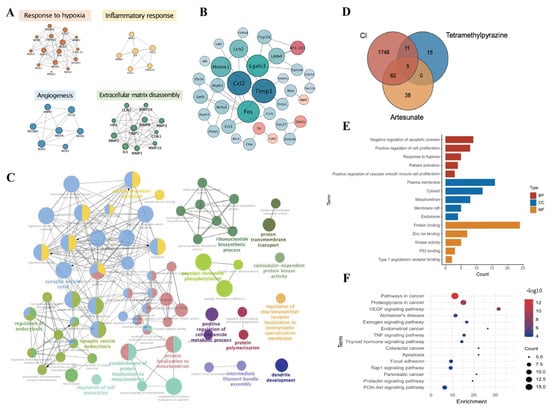 Prediction of the effects of AS and TMP intervention on progression of Cerebral Ischemia. (A) Analysis of a clinically highly recognized biomarker. (B) Integration analysis of transcriptome results. (C) Integrated analysis of proteome results. (D) Obtaining candidate targets. (E) GO analysis. (F) KEGG analysis.