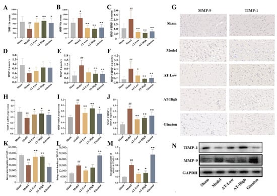 In vivo experiments and the levels of MMP-9 and TIMP-1 in serum and the infarcted cortex were determined through multiple strategies, including ELISA, immunohistochemistry, RT-PCR, and Western blotting, which were the key factors closely related to BBB injury in ischemic stroke. ELISA results showed that the level of TIMP-1 in serum was significantly decreased, while the level of MMP-9 and the proportion of MMP-9 and TIMP-1 were significantly increased in the model group. The levels of TIMP-1 were significantly increased, and the levels of MMP-9 and the proportion of MMP-9 and TIMP-1 were significantly decreased after AT and Ginaton treatment (Figure 5A–C). Moreover, ELISA results in the infarcted cortex (Figure 5D–F), RT-PCR results (Figure 5H–J), Western blotting results (Figure 5K–N), and immunohistochemistry results (Figure 5G) were also similar to the above results.