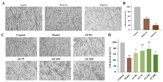 An OGD model was established to simulate ischemia/hypoxia stimulation at the cellular level, and it was used to evaluate the efficacy of the AS and TMP combination on cell damage. Results showed that cells in the control group had uniform distribution and full morphology, while the shape of the cells in the OGD group was abnormal, manifested as cell shrinkage. Moreover, the cell quantity in the model group significantly decreased, and the survival rate was reduced at 4 h and 6 h after OGD modeling (48.91% and 20.59%, respectively) (Figure 6A,B). On the contrary, 50, 75, and 150 μM of AT could increase the survival rate of cells effectively (Figure 6C,D), indicating that AS combined with TMP has an apparent protective effect on cell damage caused by OGD.