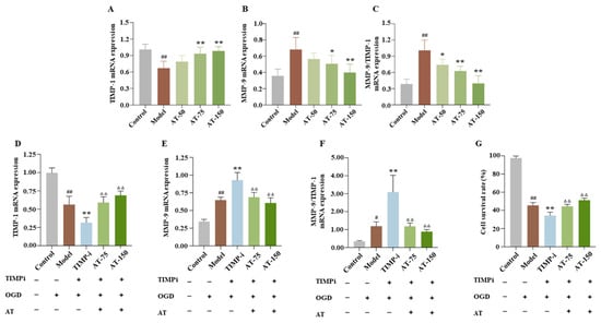 TIMP-1 played a crucial role in the mechanism of combined AS and TMP treatment for OGD injury in SK-N-BE cells. (A,D) TIMP-1 mRNA expression. (B,E) MMP-9 mRNA expression. (C,F) MMP-9/TIMP-1 mRNA expression. (G) Cell survival rate. # p < 0.05 compared with sham group; ## p < 0.01 compared with sham group; * p < 0.05 compared with model group; ** p < 0.01 compared with model group; ΔΔ p < 0.01 compared with TIMP-i group.