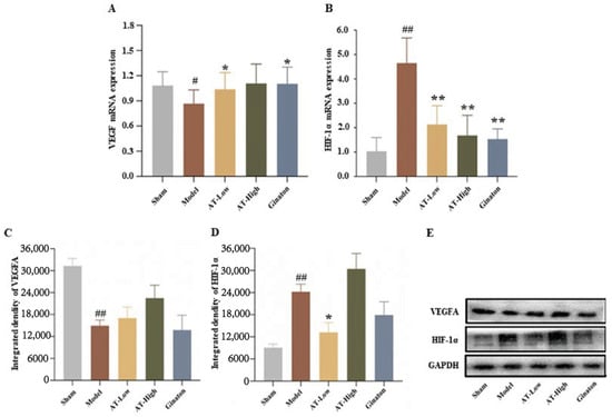 Compared with the sham group, the mRNA and protein of VEGF in the model group decreased significantly, while the mRNA expression of VEGF increased after the treatment of a low dose of AT (Figure 8A). However, AS and TMP administration could have increased the protein expression of VEGF, but there was no significant difference (Figure 8C). The mRNA and protein expression of HIF-1α in the model group significantly increased compared with the sham group, while the low dose of AT could have decreased the mRNA and protein expression of HIF-1α, and the high dose of AT could have decreased the mRNA expression of HIF-1α (Figure 8B,D).