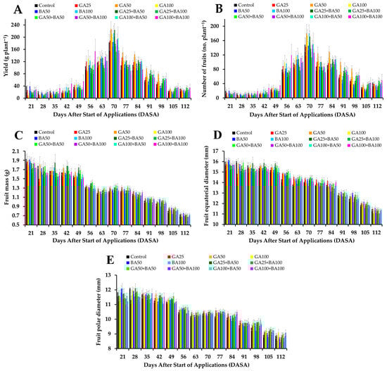 Effect of gibberellic acid (GA3) and benzylaminopurine (BA) on yield (g plant−1) (A), number of fruits (no. plant−1) (B), fruit mass (g) (C), fruit equatorial diameter (mm) (D) and fruit polar diameter (mm) (E) in Vaccinium corymbosum ‘Biloxi’ fruits in the days after the start of application (DASA) in the 2023 yield cycle. Bars represent the standard error of the mean.