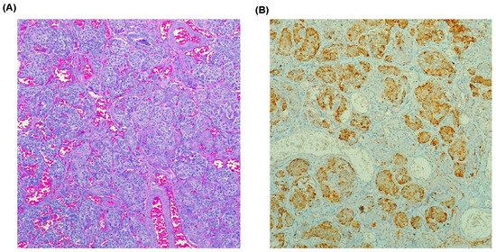The female patient initially presented to our service at 6 years and 3 months old. She was the third child of healthy, non-consanguineous Mexican parents (mother 36 years old; father 37 years old) with no significant medical history related to their daughter’s condition. The pregnancy was complicated by maternal hypoglycemia, pre-eclampsia, and threatened abortion, which was managed with absolute rest and finally resolved via cesarean section at 35 weeks of gestation due to premature rupture of membranes. No information was available regarding placentation. At birth, the patient weighed 2765 g, measured 46 cm in length, and had a head circumference of 34 cm. The APGAR score was 8/9, and Silverman’s score was 4. Soon after birth, she was diagnosed with a discrete frontal hemangioma, and ultrasound evaluation revealed hepatomegaly and diffuse liver disease. Routine metabolic and auditory neonatal screening results were normal. However, the patient developed neonatal sepsis due to Escherichia coli; this was successfully treated with meropenem and amikacin and resolved at 16 days of extrauterine life. At 1 month of age, the patient experienced seizures attributed to severe non-syndromic hypoglycemia (blood glucose < 40 mg/dL; reference value 70–100 mg/dL) that was caused by hyperinsulinism (serum insulin 20.8–39.9 uU/mL, ref. 6–27 uU/mL; C-peptide: 2.4 ng/mL; ref. 0.9–4 ng/mL) and proved refractory to pharmacological management. A brain ultrasound showed findings consistent with periventricular hypoxia. To further investigate the etiology of the hyperinsulinism, an abdominal positron emission tomography (PET) scan using Gallium-68 was performed; this study revealed overexpression of the somatostatin receptor in the body and tail of the pancreas, suggesting a diagnosis of nesidioblastosis. Accordingly, within her first 50 days of extrauterine life, the patient underwent a subtotal pancreatectomy (95%) with resection of the head, body, and tail of the pancreas (5 × 1.5 cm2, 6 g). This procedure alleviated the hypoglycemic crisis, yielding a serum insulin level of less than 2 uU/mL (ref. 6–27 uU/mL) and a C-peptide level of 0.4 ng/mL (ref. 0.9–4 ng/mL). Histopathological analysis of the resected pancreatic tissue revealed cytologically normal tissue but the presence of an increased number of hyperplastic pancreatic islets characterized by slight enlargement of islets and cell nuclei with prominent nucleoli. Immunohistochemical staining of resected pancreatic tissue was positive for insulin and chromogranin, confirming the diagnosis of diffuse nesidioblastosis (Figure 1).