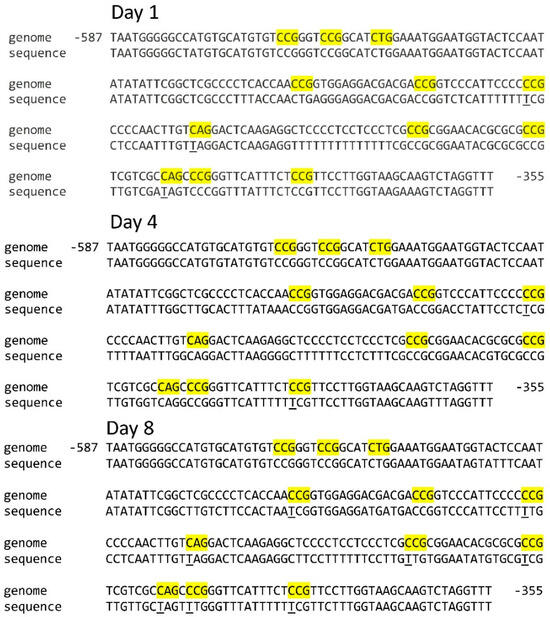 The methylation status and the distribution pattern of methylated cytosine in CG, CNG, and CNN sites of the Sdh3-1, Sdh3-2, and Sdh4 genes were assessed on days 1, 4, and 8 of germination. The primers were selected taking into account the assessment of the region located immediately above the transcription initiation zone (transcription start site, TSS) [17]. For the Sdh3-1 gene promoter, the promoter region for analysis corresponded to the position −238…−488, for Sdh3-2, −355…−587, and for Sdh4, −153…−411.