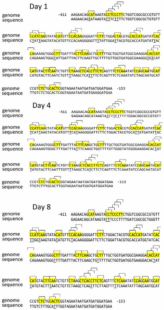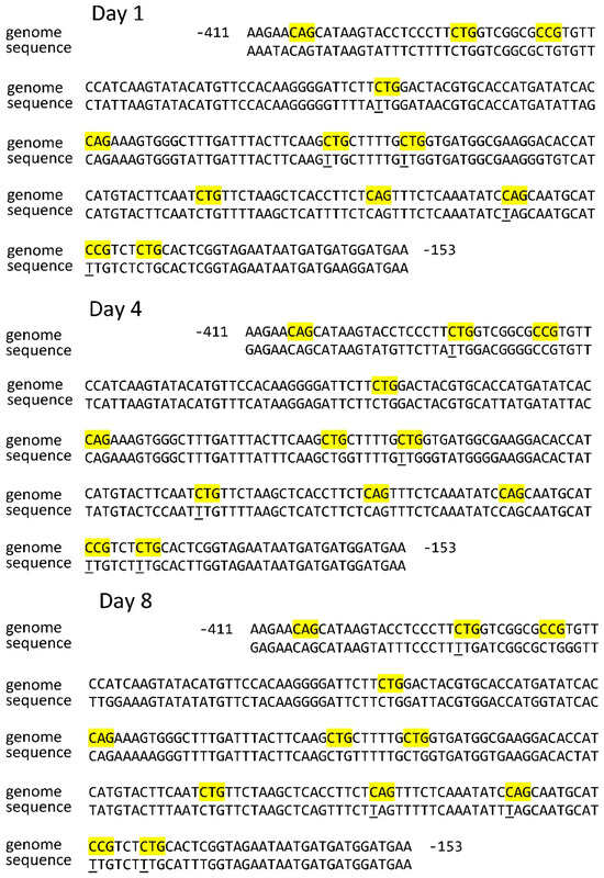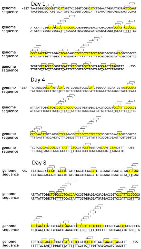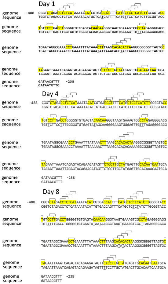 However, the distribution pattern of methylated cytosines in the promoter sequence of the Sdh4 gene revealed more significant changes. The CNN sites at positions −184, −366, and −395 were unmethylated throughout the entire period of seed germination. The asymmetric sites that were constantly in a methylated state in the Sdh4 gene promoter were uniformly distributed along the promoter sequence. A significant portion of the CNN sites changed methylation status at different stages of maize seed germination. Six sites (−237, −221, −237, −349, −352, and −392) changed their methylation status in a wave-like manner, being methylated on days 1 and 8 of seed germination. Three sites (−201, −222, and −299) changed their methylation status in opposite directions, being methylated on day 4.