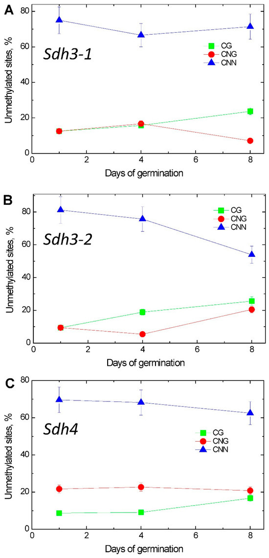 The cytosine methylation status of the Sdh3-2 promoter undergoes major changes during seed germination in the context of various methylation sites: CG, CNG, and CNN. On the first day of seed germination, a significant proportion of unmethylated cytosines was seen in CNN sites (81%); the rest (9.5% each) accounted for cytosines in CG and CNG sites. On the 4th day, a significant redistribution of the cytosine methylation status between CG and CNG sites occurred. On the 8th day, the distribution of the proportion of unmethylated cytosines in the Sdh3-2 promoter indicated the significant redistribution of the cytosine methylation status within the analyzed sites. A significant decrease in the unmethylated CNN sites was observed, with a corresponding increase in the proportion of unmethylated cytosines in CG and CNG sites (Figure 7B). The changes in cytosine methylation status of the Sdh3-1 promoter are much less pronounced (Figure 7A), and the changes in cytosine methylation status of the Sdh4 are negligible (Figure 7C).