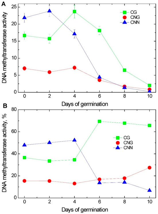 The study of the DNA methyltransferases methylating CG sites revealed that their high level of activity was observed at the beginning of germination, with the maximum on the 4th day, after which the activity decreased. The CNG DNA methyltransferases exhibit a similar profile with a lower activity and its less pronounced changes (Figure 8A). The activity of DNA methyltransferases methylating CNN sites has the maximum value on the 2nd day of germination, decreasing by the 10th day of germination by more than a hundred times. This which the most pronounced change among the DNA methyltransferases (Figure 8). Until the 4th day of seed germination, there were no significant changes in the redistribution of cytosine DNA methyltransferase activities. Then, the contribution of CNN DNA methyltransferases decreased, and the input of CNG DNA methyltransferases to the total activity increased almost twice (Figure 8B).