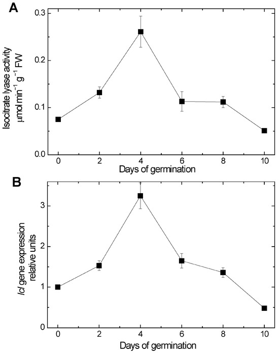 Changes in isocitrate lyase activity (A) and in expression of Icl gene (B) during germination.