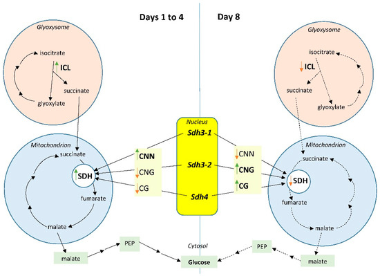 The fine control of Sdh gene expression is particularly important during the germination of oil-storing seeds, when the β-oxidation of fatty acids and further conversion of acetyl-CoA in the glyoxylate cycle result in the formation of large quantities of succinate. At that time, succinate is formed in both the tricarboxylic acid cycle and in the glyoxylate cycle, and the flux through the glyoxylate cycle at the peak of its activity significantly exceeds the flux through the TCA cycle [23,24]. Isocitrate lyase provides the operation of the glyoxylate cycle, which is a stage of gluconeogenesis, and forms succinate, i.e., it ensures the mobilization of reserve lipids in germinating seeds. The induction of isocitrate lyase thus can indicate the intensification of biosynthetic metabolic processes, including gluconeogenesis, in oil-storing tissues during seed germination, for the operation of which the coordination of the Sdh genes can exert a control over the transcriptional activity of genes and the synthesis of the corresponding SDH isoenzymes [24,25]. Both an increase in activity and an increase in the expression of the Icl gene were observed during germination, with the peak on day 4, following the decline (Figure 9A,B). Although there is an indication that the excess of succinate can be converted in glyoxysomes by an oxidase having low affinity to succinate [11], the main route of succinate conversion is its oxidation in mitochondria by SDH. The synthesis of the SDH subunits at this time is necessary for the effective operation of mitochondrial metabolism and the intensification of the mobilization of succinate formed in the glyoxylate cycle.