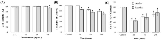 As can be observed in Figure 1A, AerExt did not affect the cell viability at the highest concentration tested (40 μg mL−1), while RootExt slightly decreased the viability to 90% (at 40 μg mL−1) compared with the control group, but not at 20 μg mL−1.