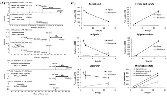 (A) HPLC–MS/MS data and (B) relative quantification (peak areas) of newly formed metabolites (ferulic acid sulfate, apigenin sulfate, and two diosmetin sulfate isomers) and their non-sulfated counterparts (ferulic acid, apigenin, and diosmetin) appearing in the apical (black) and lower (gray) compartments of HBMEC cell experiment after AerExt (40 µg mL−1) treatment at different incubation times (2, 4, and 24 h).