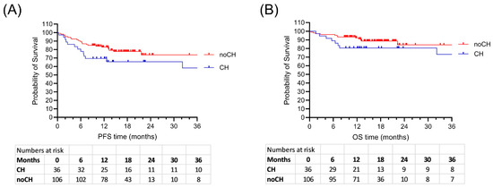 Reduced survival of patients with CH in the entire cohort comprising 64 myeloma, 47 lymphoma, and 31 AML. (A) Progression-free survival, p = 0.043. (B) Overall survival, p = 0.163.