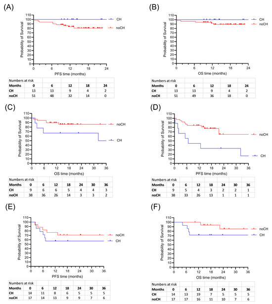 In lymphoma patients, OS tended to be shorter in patients with CH (p = 0.078) (Figure 2C,D). Moreover, relapse rates were significantly higher in lymphoma patients with CH (p = 0.007) (Table 3). Six patients in the CH group (67%) and 32 patients in the noCH group (84%) reached complete remission (p = 0.34). Two CH patients (22%) and one noCH patient (3%) developed progressive disease after ASCT (p = 0.09). Relapse or progression after ASCT was documented in six (67%) of the CH patients and six (16%) of the noCH patients (p = 0.005). The median follow-up was 22.6 months in the CH group and 15.9 months in the noCH group (p = 0.45).