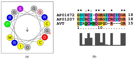 (a) The helical wheel projection of a peptide sequence show the distribution of amino acid residues around an alpha-helix. The amino acids are arranged in a circle, each representing a turn in the helix (per turn 3.6 residues). The arrow indicates the direction of the helix axis. The blue color (R) represents the positively charged (arginine) residue. The red color (D) indicates the negatively charged aspartic acid residue. The yellow (C, M, I) color indicates the hydrophobic residues (cysteine, methionine, isoleucine). The green (P) color represents the proline (structurally unique, often induces kinks) residue. The grey (G, G, G) color code represents the glycine (small, flexible) residue. The pink (Q) color represents the polar, uncharged (glutamine) residues and purple (S) color represents the polar, uncharged (serine) residues. The C and N represent the C-terminal and N-terminal regions of the peptide. (b) Sequence similarity of AVT-peptide with RC-101 (AP01672) and Retrocyclin-1 (AP01207) represents the hydrophobic (G, I, and C) and cationic residues (R), which are conserved in the functional domain of the peptides and are crucial for antimicrobial activity. “*”/“**” indicates the identity of the aminoacid in the sequence alignment. “:” indicates the high similarity with substitution of aminoacids in the position of the sequence alignment.